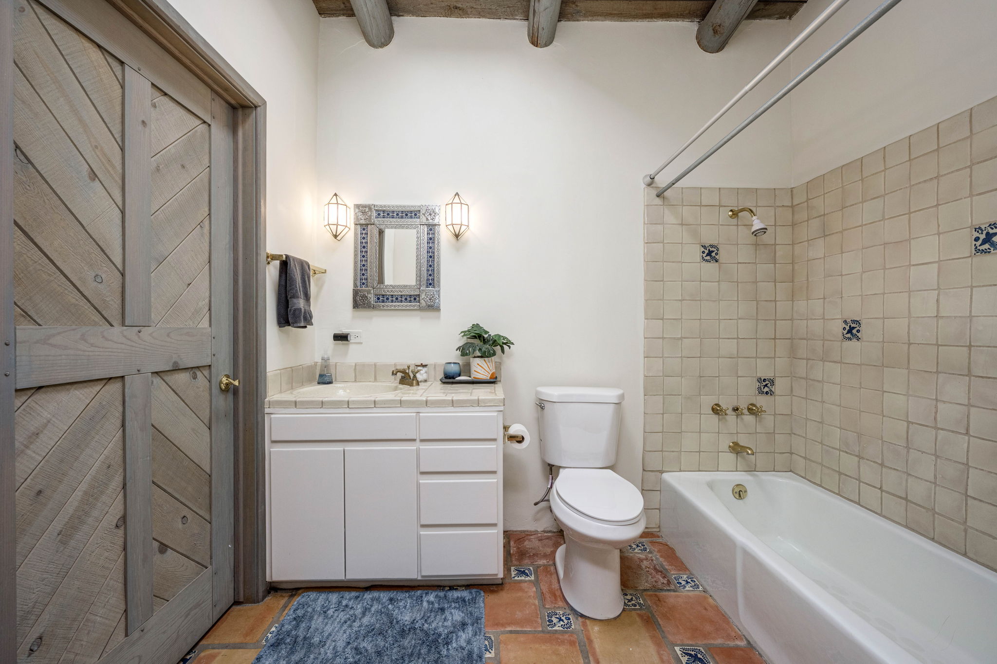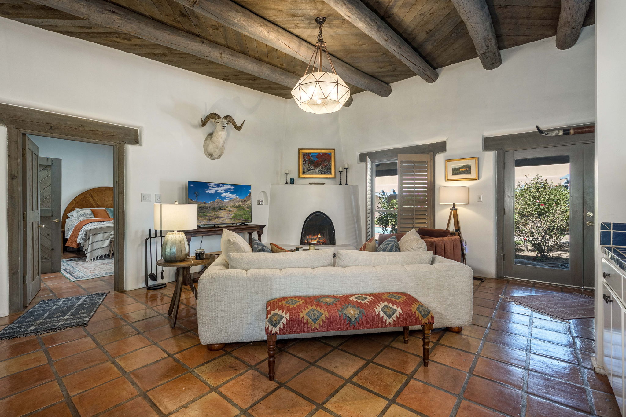 Inside, you’ll find beautiful Saltillo tile, granite countertops, stainless steel appliances, and charming kiva fireplaces that bring authentic Southwestern character throughout. The home centers around a grand courtyard with a sparkling pool and a wraparound porch—perfect for entertaining or relaxing in privacy.